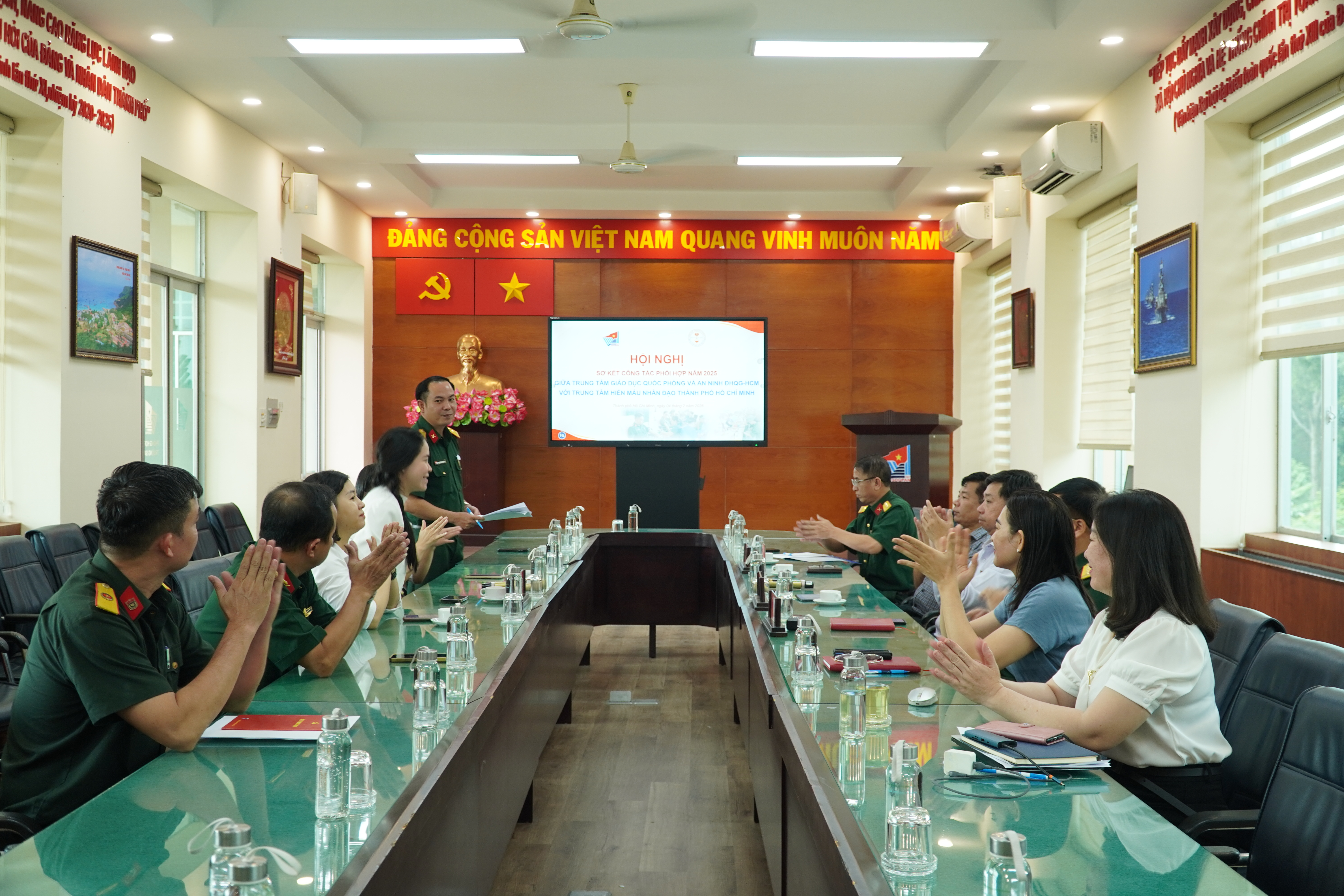 Chiều ngày 04/02/2026, tại phòng họp Trường Sa, Trung tâm Giáo dục Quốc phòng và An ninh (GDQPAN), Đại học Quốc gia Thành phố Hồ Chí Minh (ĐHQG-HCM) tổ chức Hội nghị sơ kết công tác phối hợp năm 2025 với các đơn vị liên kết gồm: Trung tâm Hiến máu Nhân đạo Thành phố Hồ Chí Minh, Hội Bảo vệ Thiên nhiên và Môi trường Thành phố Hồ Chí Minh, Bệnh viện Quân dân y Miền Đông và Bảo tàng Quân khu 7.